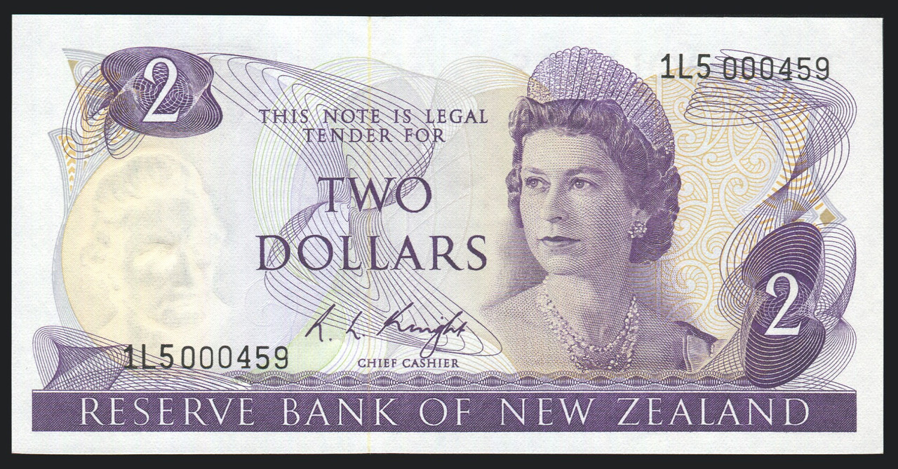 - New Zealand - $2 - Knight - 1L5 000459 - First Prefix - Low Serial - Unc