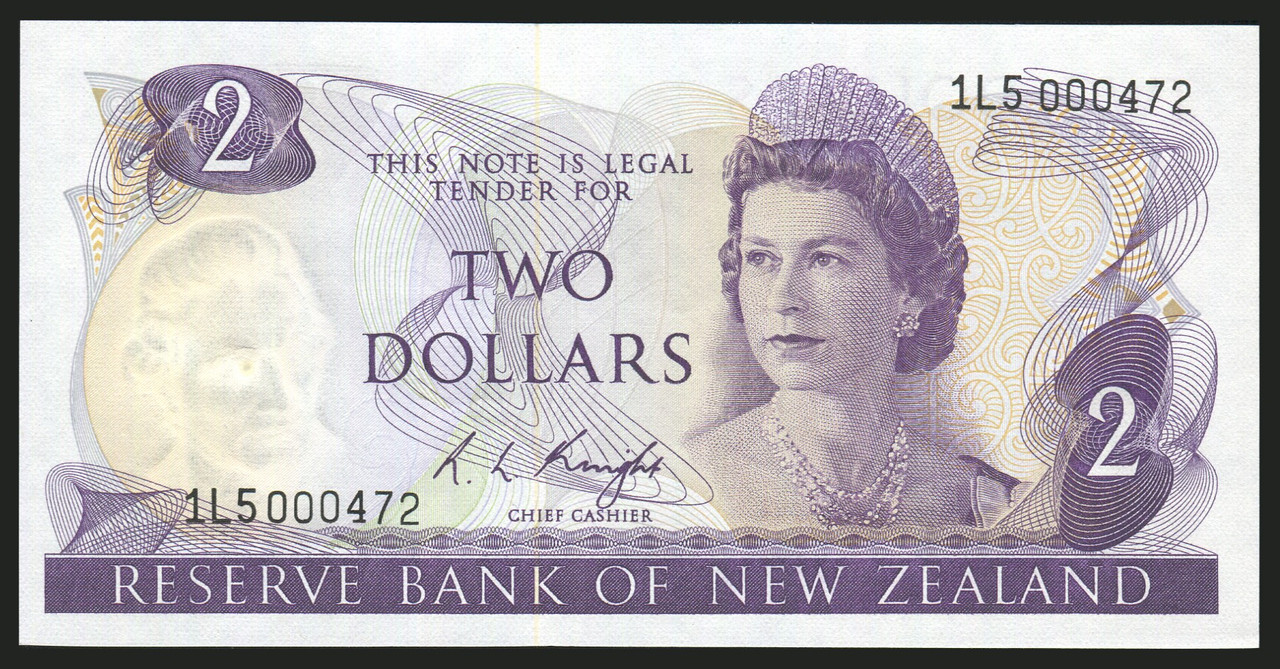 - New Zealand - $2 - Knight - 1L5 000472 - First Prefix - Low Serial - Unc