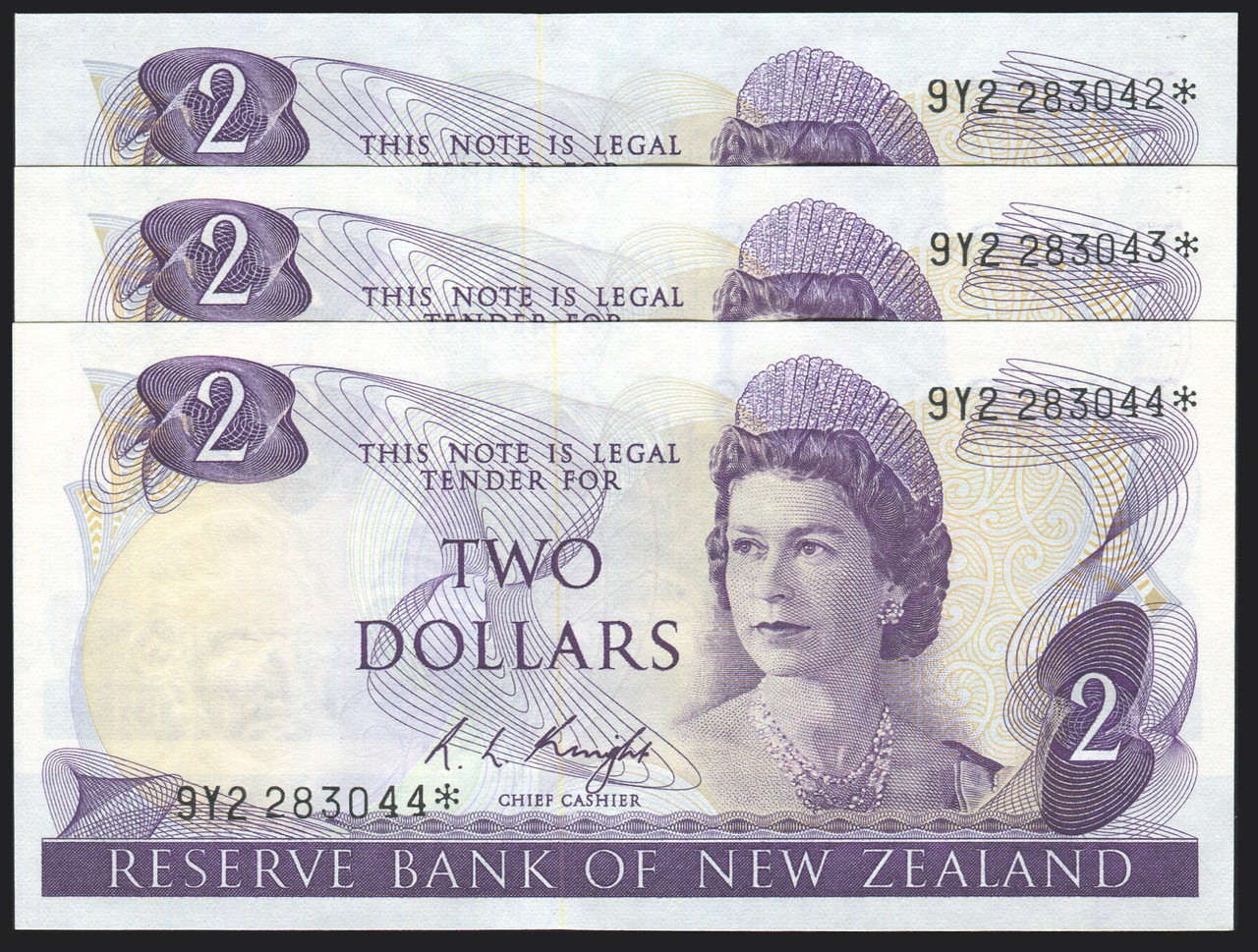 - New Zealand - $2 - Knight - Y92 283042*-44* Consecutive Trio - Star Note - Unc
