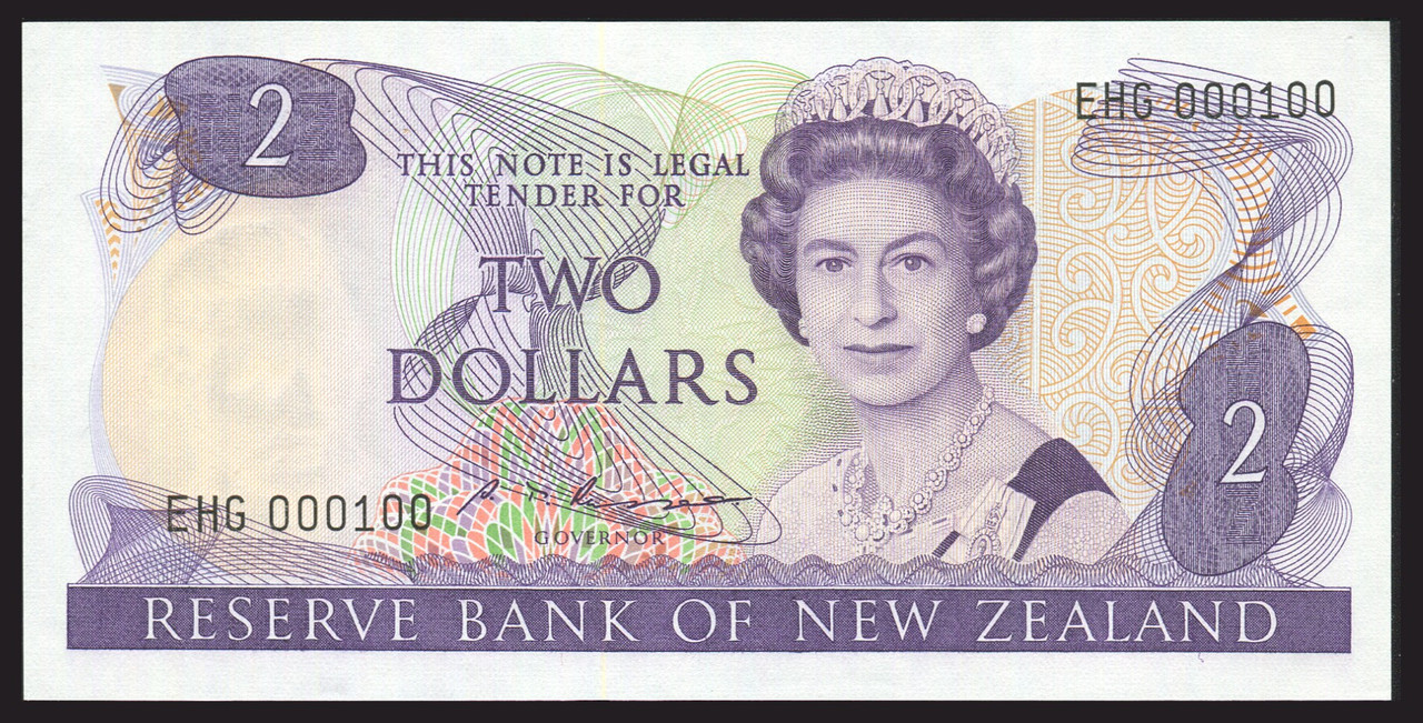 - New Zealand - $2 - Russell - EHG000100 - First Prefix - Low Serial - Unc