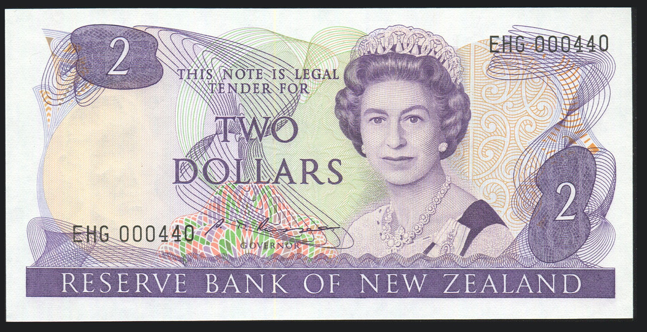 - New Zealand - $2 - Russell - EHG000440 - First Prefix - Low Serial - Unc