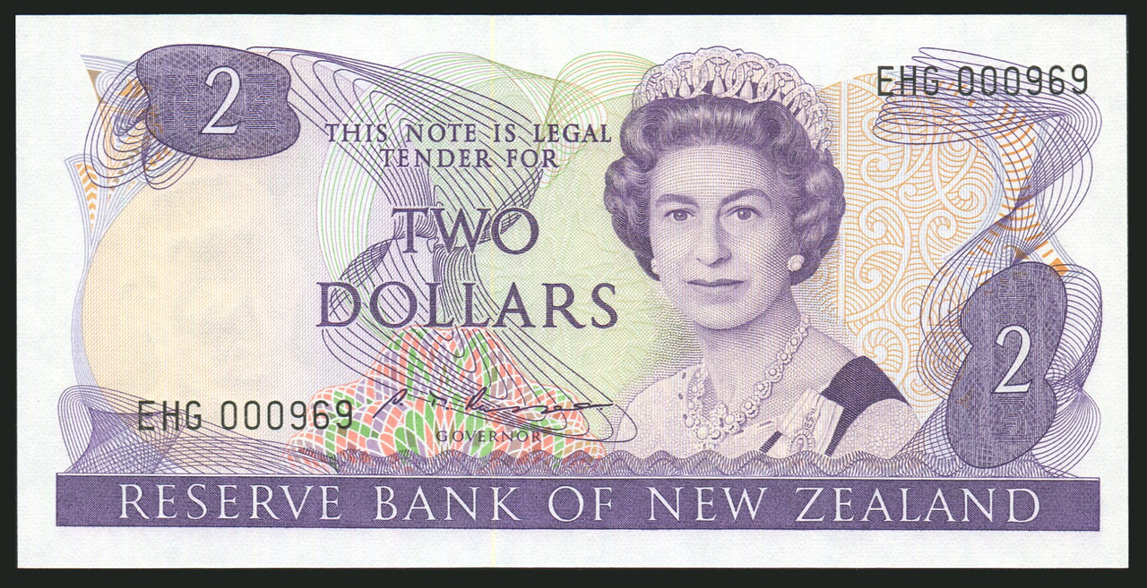 - New Zealand - $2 - Russell - EHG000969 - First Prefix - Low Serial - Unc