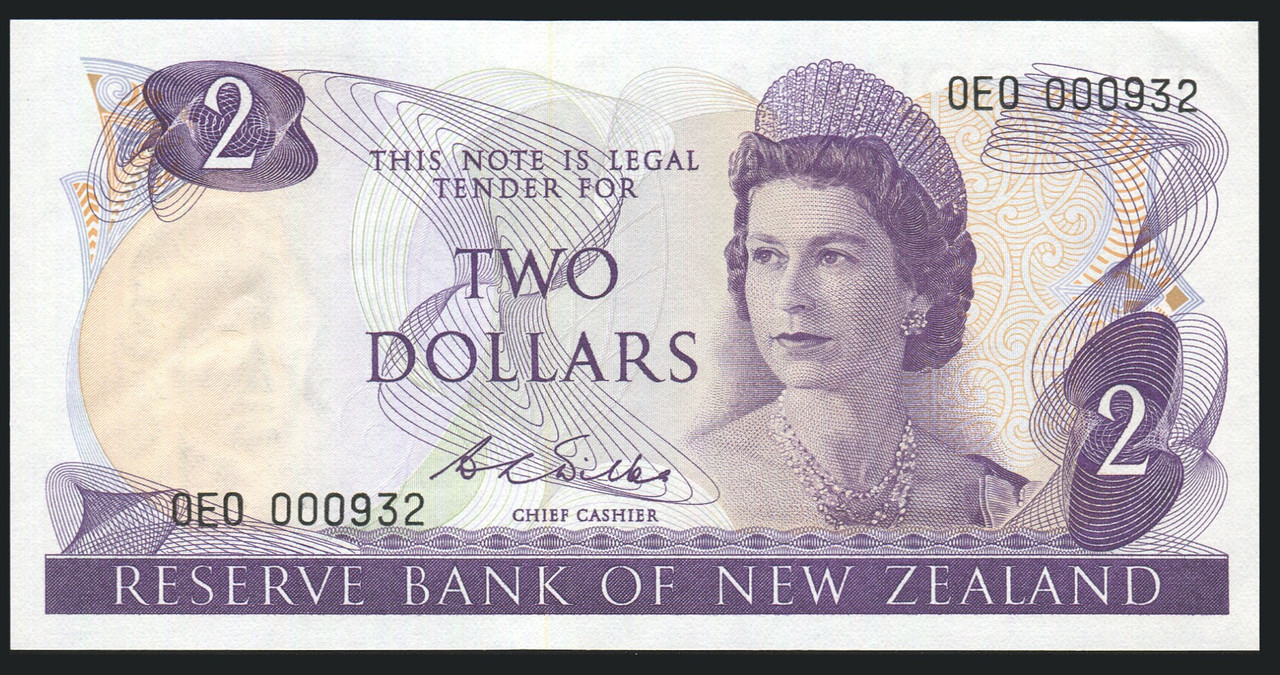 - New Zealand - $2 - Wilks - 0E0 000932 - First Prefix - aUnc