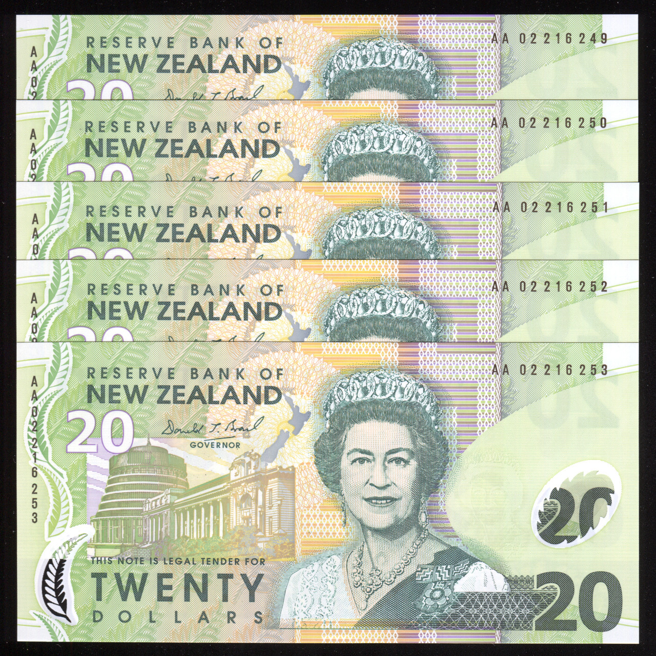 New Zealand - 20 Dollars - Brash - AA02 216249-53 - First Prefix - 5 Consecutive - Unc
