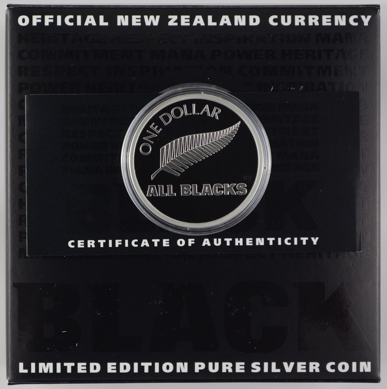 The 1 troy oz silver proof coin has been struck in 0.999 pure silver with a black reverse face. The coin is unmistakably All Blacks, and the black background is given even more impact with the fern design rendered in low-relief and clearly visible when viewed from different angles. Shining through in the centre of the coin is the ‘one dollar’ denomination and the official All Blacks logo shown in the strength of pure silver.
