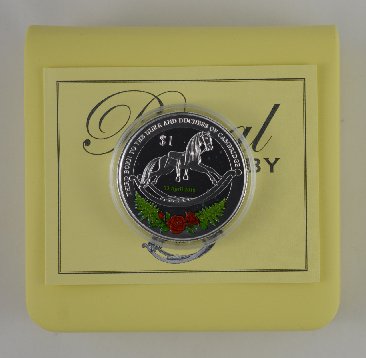 This intricately detailed 1oz silver proof coin reflects the close relationship that New Zealand has with the Monarchy as a Commonwealth nation. The centre depicts a royal family heirloom: a rocking horse that belonged to Princess Margaret. Beneath the rocking horse on the rim of the coin is the English rose, combined with the New Zealand fern. It will also feature the baby's date of birth. The face value is $1.