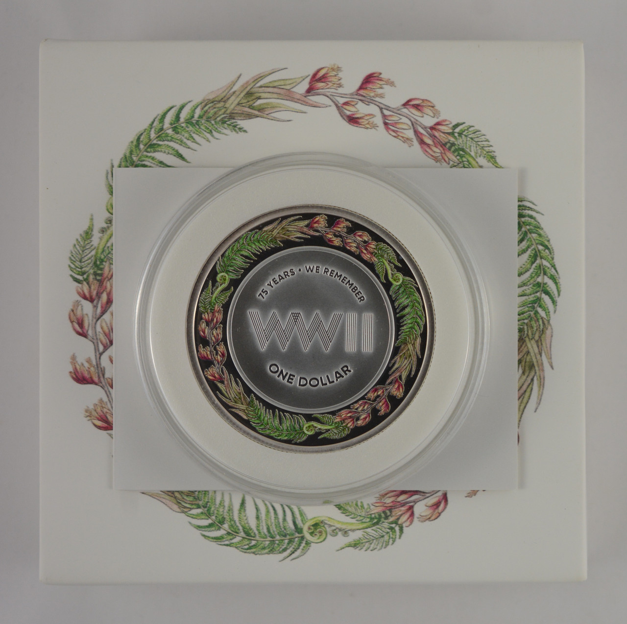 The Remembrance coin is a reminder of the impacts of WWII - the war took the life of one in every 150 New Zealanders. It changed the landscape of New Zealand society, and those impacts are still apparent today. This coin commemorates this anniversary with a wreath of native New Zealand flora.