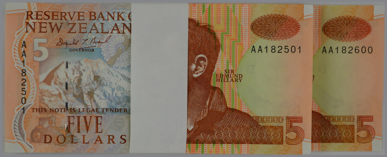New Zealand - $5 - Bundle x100 Consecutive Banknotes - Brash - First Prefix - Unc