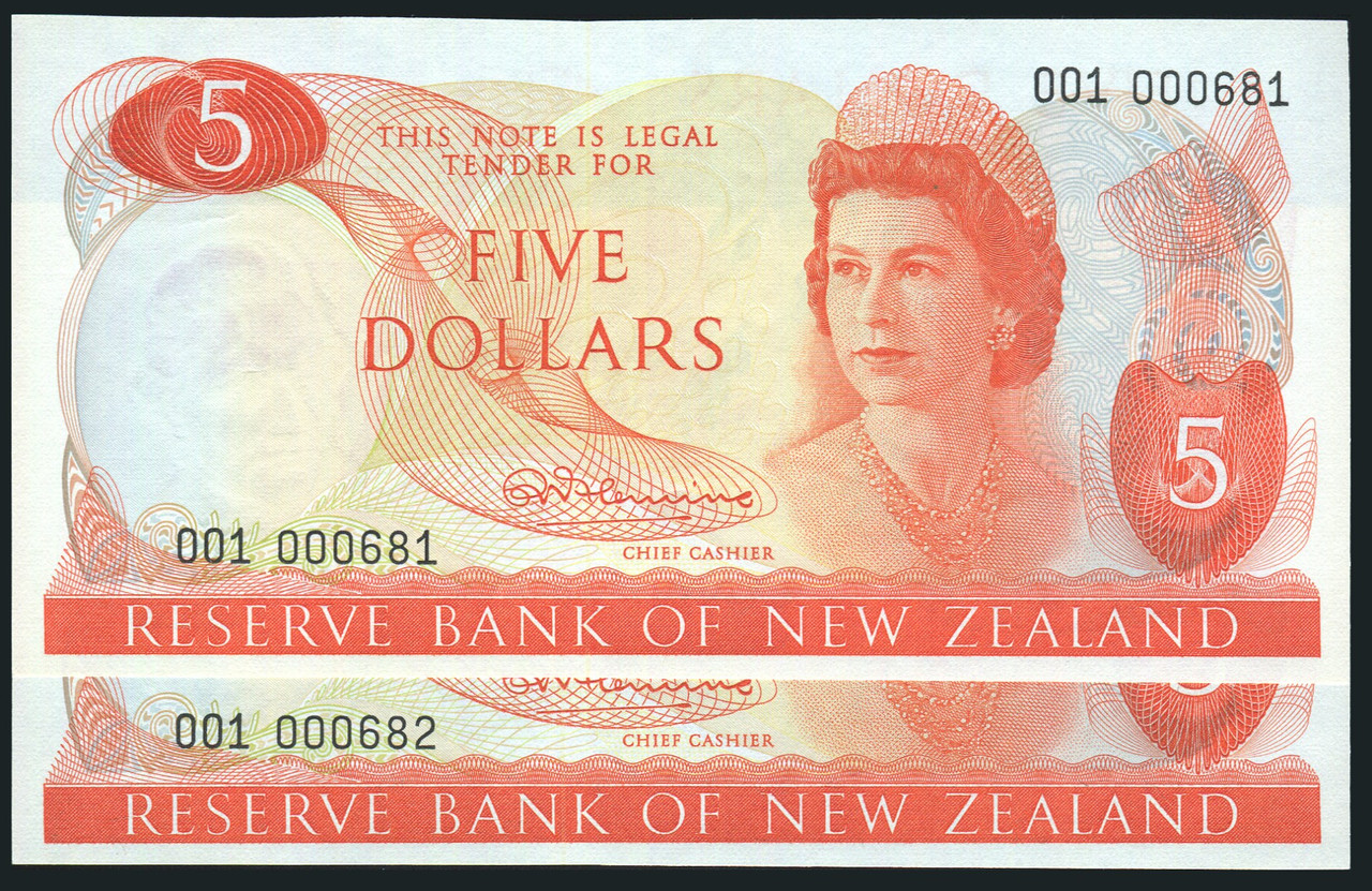 - New Zealand - $5 - Fleming - 001 000681-682 - Consecutive Pair - First Prefix - Unc