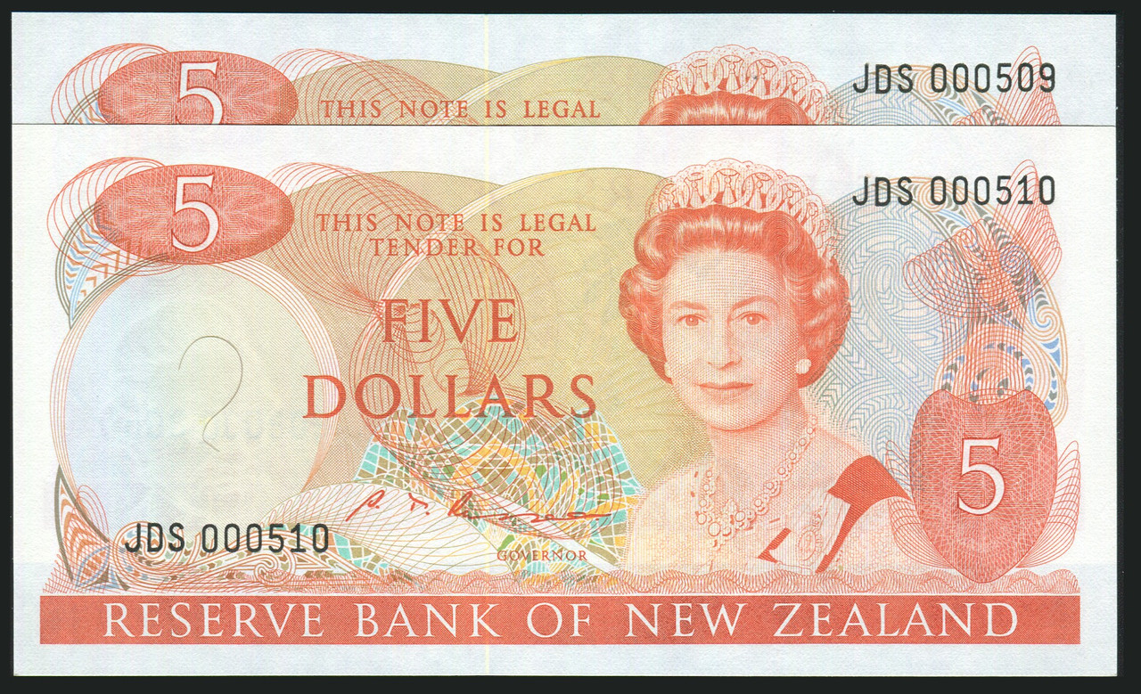 New Zealand - $5 - Russell - JDS000509-510 - First Prefix - Consecutive Pair - Unc